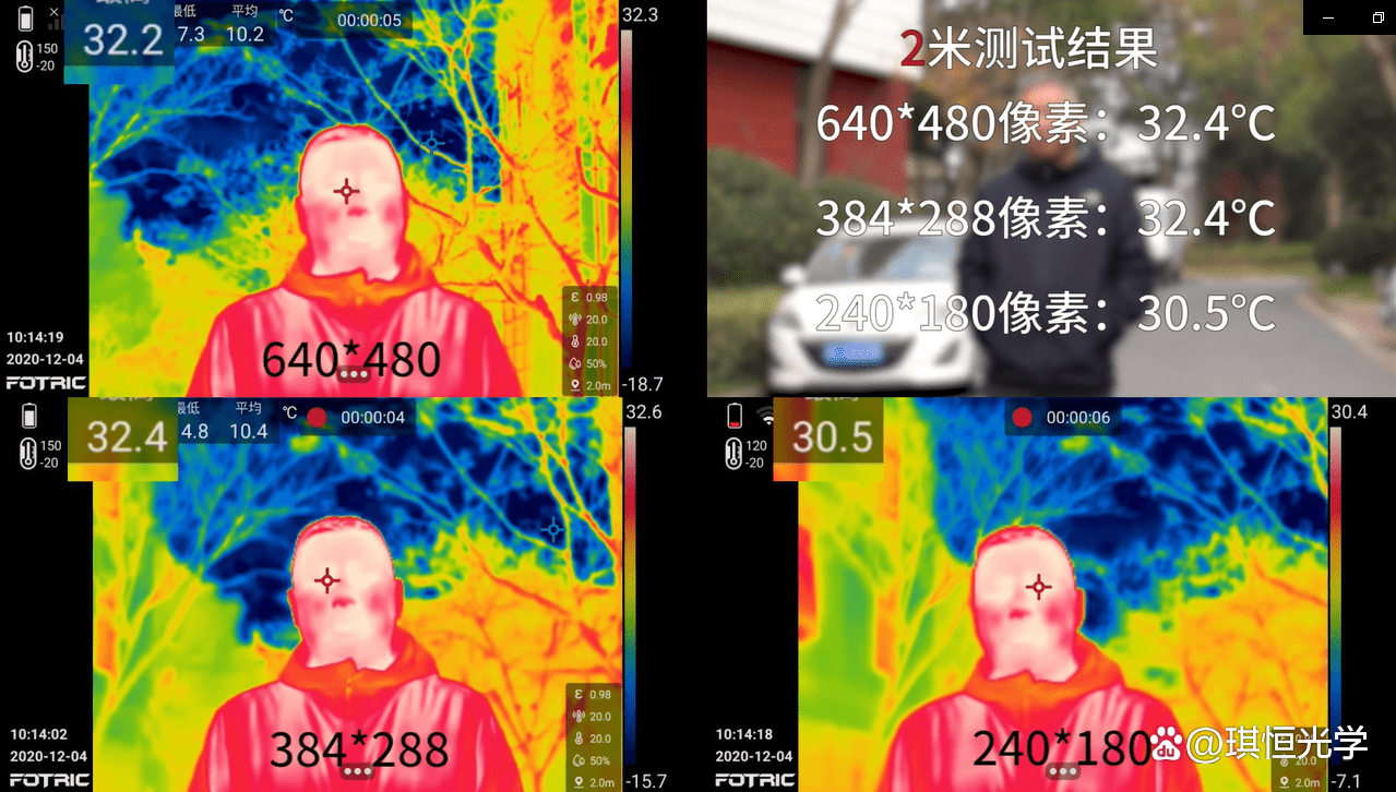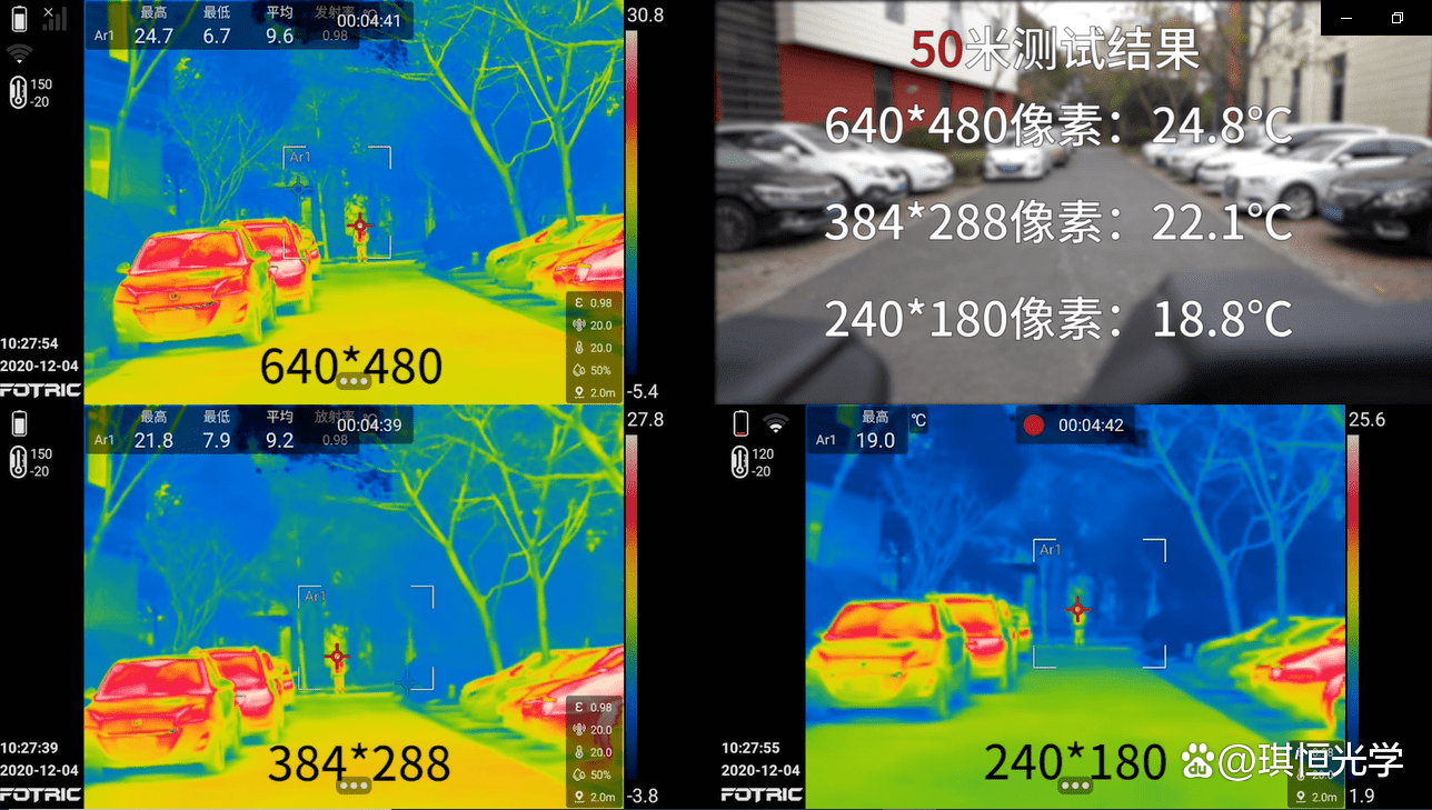 可以看出来在测试相同的目标,距离比较近的范围内都能准确测温,但长距离时,由于被测物体在画面中所占比例过小,出现测温衰减,像素越高的热像仪所能拍摄出的热像图越清晰。